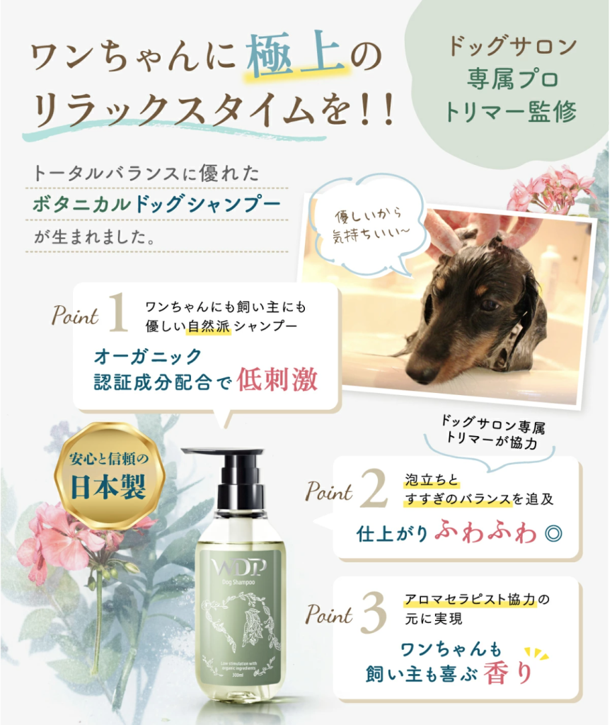 オーガニック認証成分や天然由来成分を配合したボタニカル低刺激シャンプー。ワンちゃんの肌に優しく、ふわふわな洗いあがりでスッキリします。泡立ちやすく泡切れが良いので節水でワンちゃんの負担も減らします。