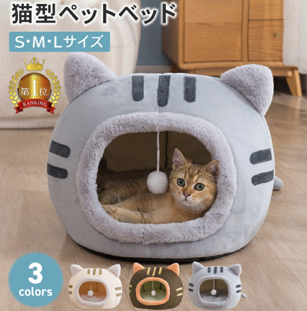 寒さからネコちゃんを守るドーム型デザインのペットベッド。ネコちゃんの形が何とも言えず可愛すぎる!後ろにはしっぽもついてディテールまでこだわっています。洗濯機での選択ができるのでいつでも清潔に使えますね。