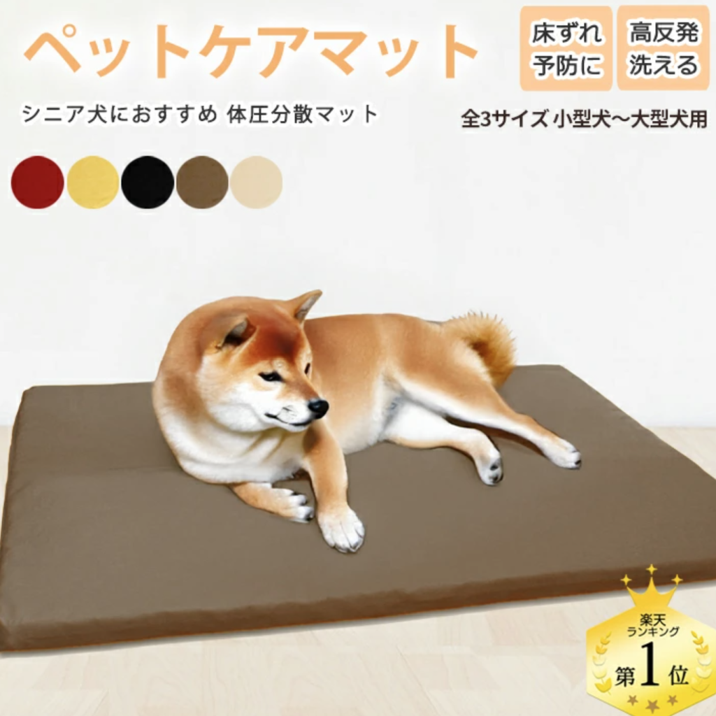 高齢のワンちゃんやケガをしているワンちゃんのケアにおすすめなケアマット。体圧分散で身体を優しく支えて床ずれをしにくくします。カバーは撥水加工でお手入れしやすく中材も丸洗いできるので安心。通気性の良いアレルAirが冬でも夏でも快適に過ごせます。