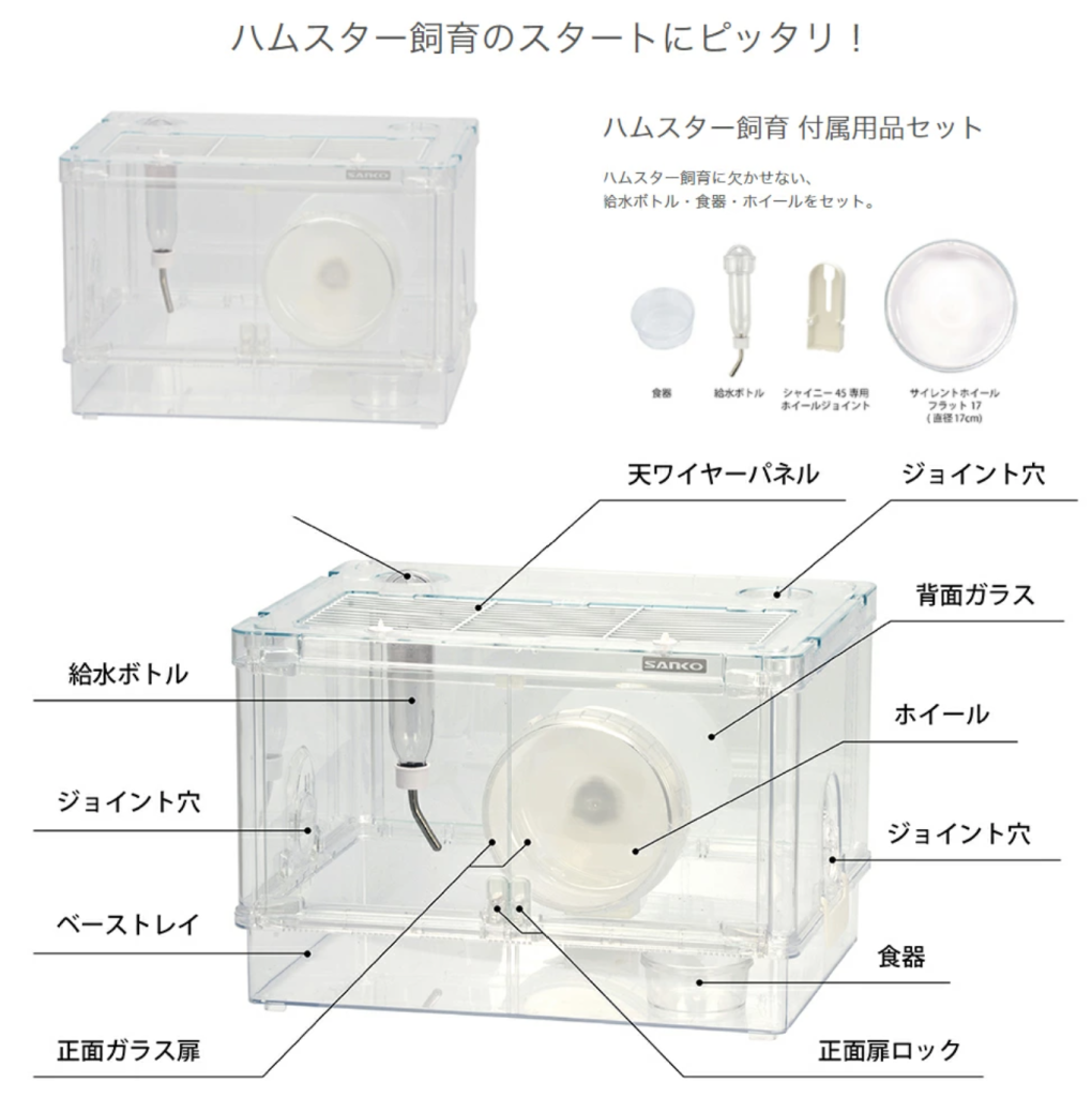中の様子がしっかり見える透明タイプで、大きな扉でお世話しやすいハムスターケージ。楽に分離できるのでお手入れも簡単でスッキリと洗えます。カクレガやパイプジョイント付きで、ハムスターの様々なかわいい姿に癒されますよ。