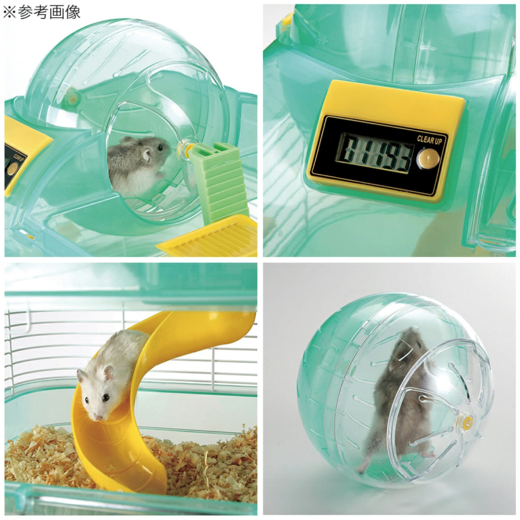 楽しい仕掛けがいっぱいで、ハムスターの生き生きとした姿が見られるハムスターケージ。ランニングカウンター付きのランニングボールや、2階部分でも遊べる立体構造、給水器やエサ皿もセットになってすぐに使えるオールインワンタイプのケージです。