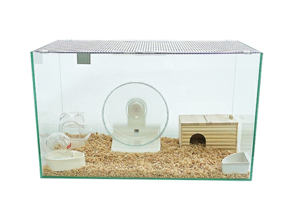 全面ガラスの水槽タイプで、傷がつきにくくお手入れもしやすいハムスターケージです。側面に網部分がないので、チップが周りに飛び散ることもなく衛生的。登ったりかじってしまうハムスターにおすすめです。
