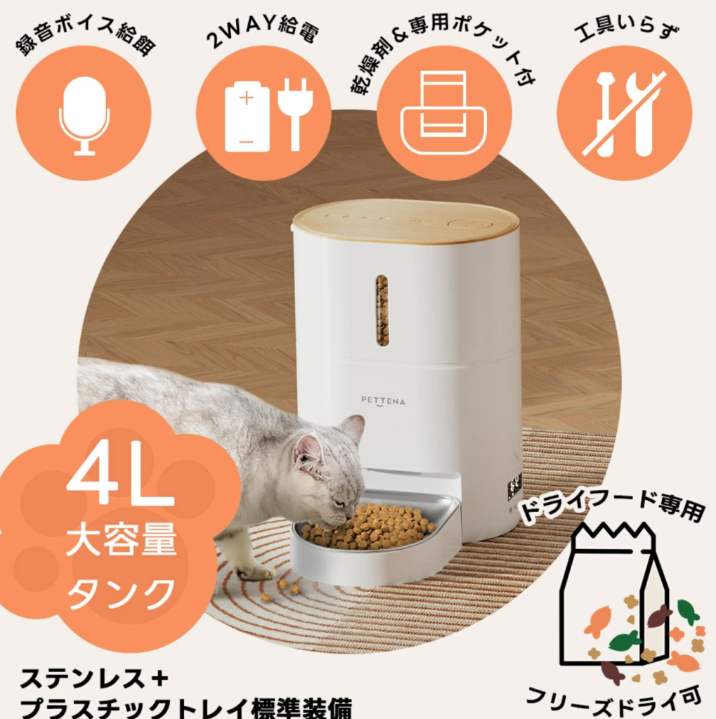 しっかり密閉のストッカーや、夜間撮影にも対応したカメラ、スマホでの管理など、多機能な自動給餌器。停電の時やコードが万が一抜けてしまった時も、自動的に電池からの給電に切り替えられるので安心ですね。